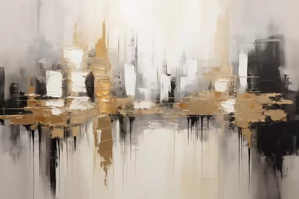 Plakāts Abstrakta pilsētas ainava ar ēku atspīdumiem ūdenī, kas veidota neitrālos toņos ar siltu toņu akcentiem. Nr f42628