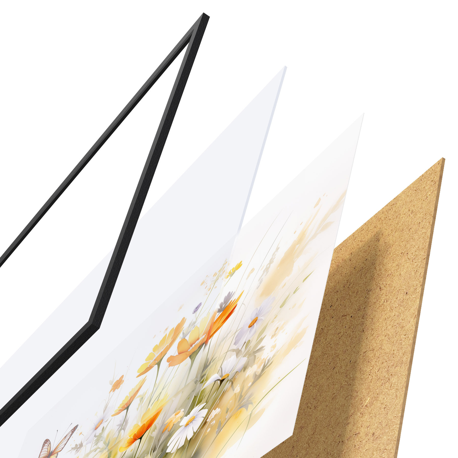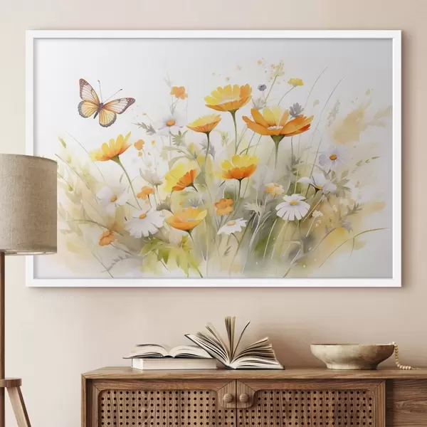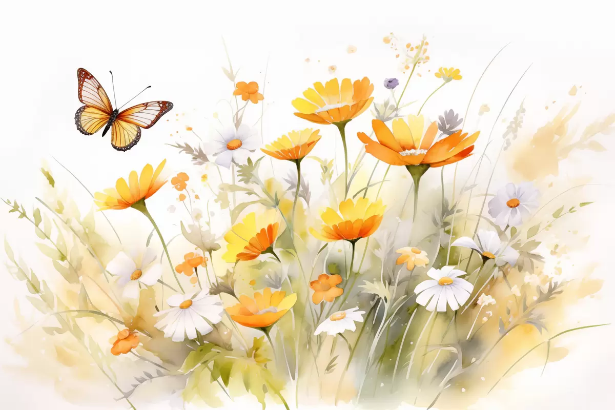 SākumlapaPlakātu katalogsPlakāti ziediPlakāts Spilgts, akvarelim līdzīgs ziedu lauks ar oranžām un baltām margrietiņām un netālu lidojošu tauriņu Nr f42714