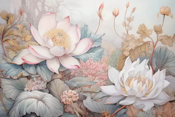 Plakāts Lieli, ziedoši lotosa ziedi maigi rozā un baltā krāsā, ko ieskauj zaļas lapas un maigi rozā zaļgani zaļumi Nr f42729