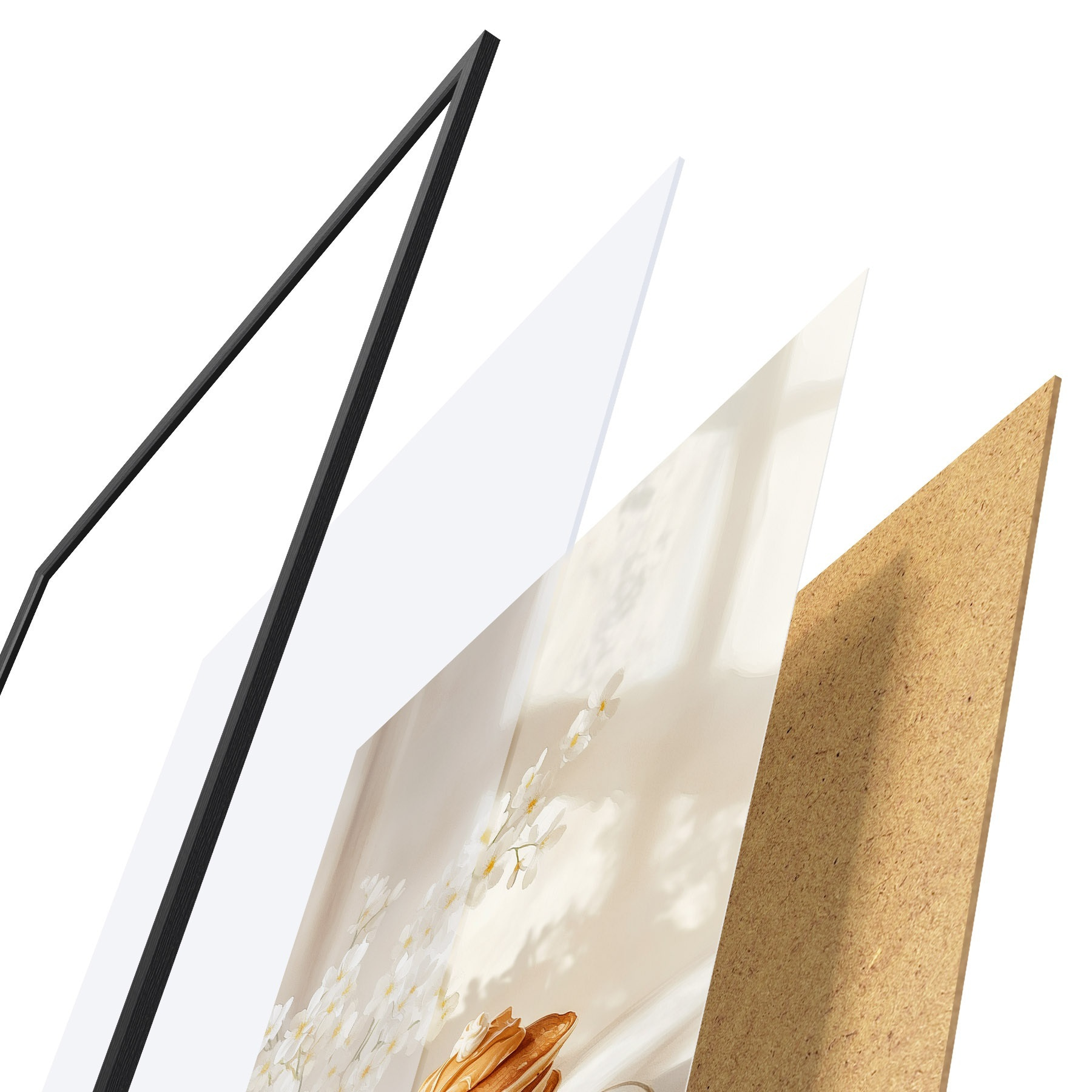 Plakāts sastāv no rāmja, pleksstikla, iespiestā attēla un skaidu plātnes pamatnes. Plakātu var uzreiz piekarināt pie sienas, pateicoties aizmugurē esošajiem stiprinājumiem.