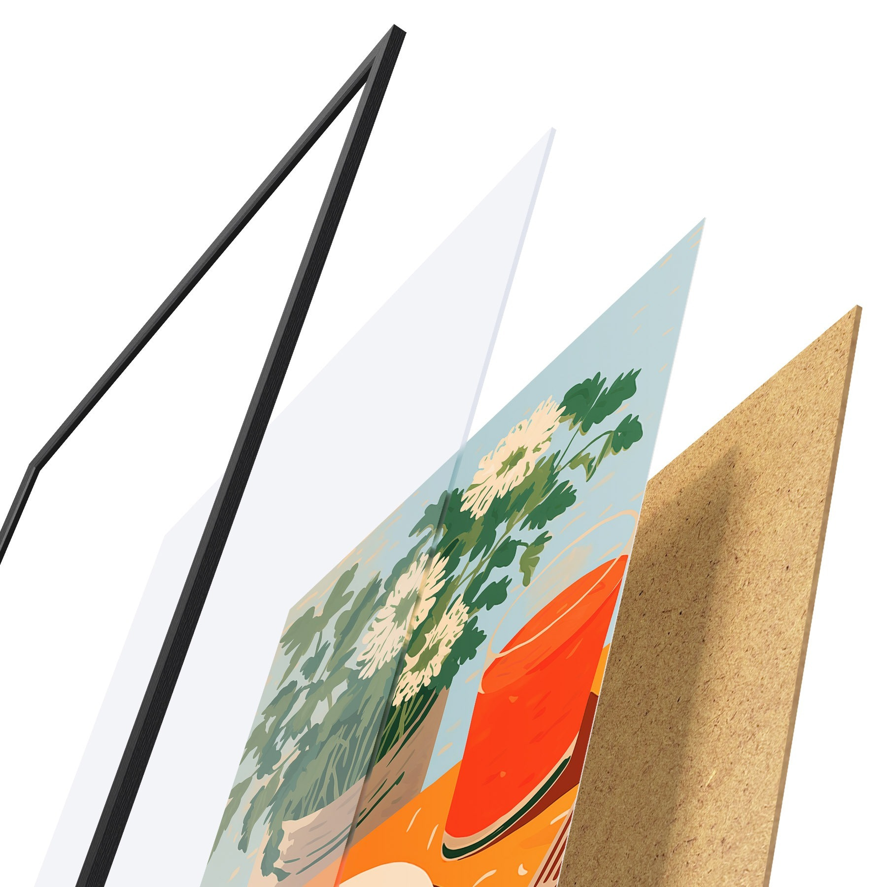 Plakāts sastāv no rāmja, pleksstikla, iespiestā attēla un skaidu plātnes pamatnes. Plakātu var uzreiz piekarināt pie sienas, pateicoties aizmugurē esošajiem stiprinājumiem.