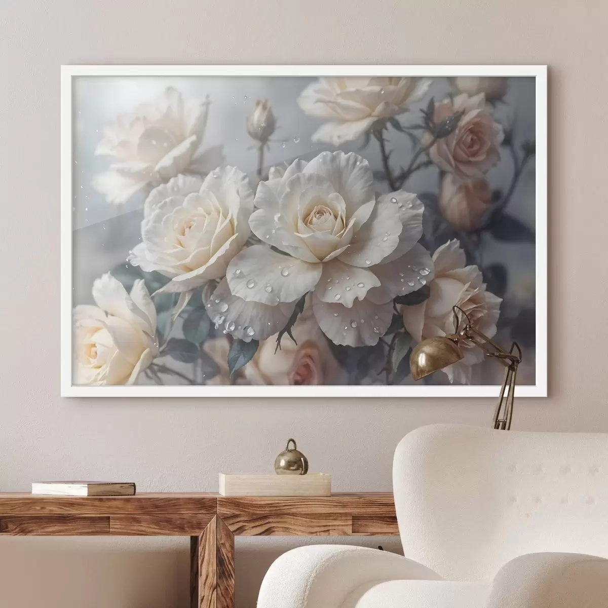 SākumlapaPlakātu katalogsPlakāti dabaPlakāts Baltu rožu grupa ar ūdens pilieniem uz ziedlapiņām, dažas zaļas lapas, pieklusināts fons, maiga gaisma Nr f43163