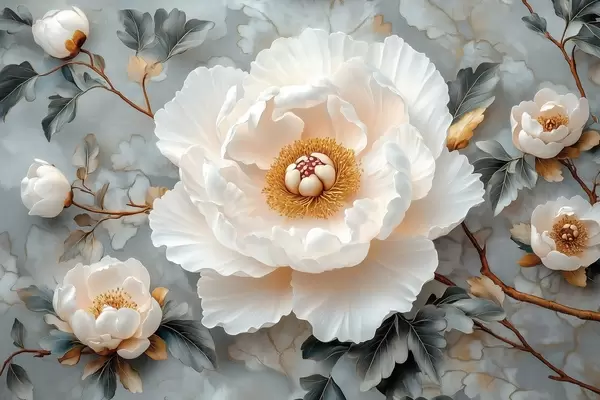 Plakāts Krāšņās peonijas uz lapu un mazu peoniju fona Nr f43315