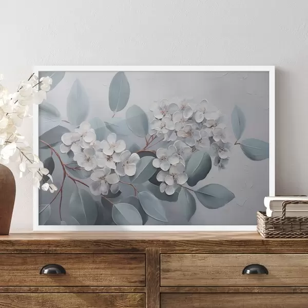 SākumlapaPlakātu katalogsPlakāti ziediPlakāts Baltās hortenzijas ziedu zariņš pilnā ziedēšanas laikā, ar zilām lapām uz gaiši pelēka fona, eļļas glezna stilā Nr f43391