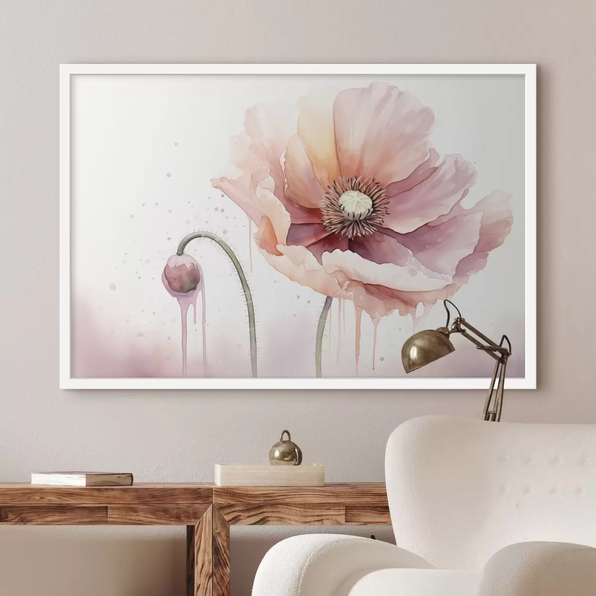 SākumlapaPlakātu katalogsPlakāti ziediPlakāts Rozā magones zieds ar pumpuru uz balta fona, akvareļglezniecības imitācija ar pilieniem, maigas krāsas Nr f43402