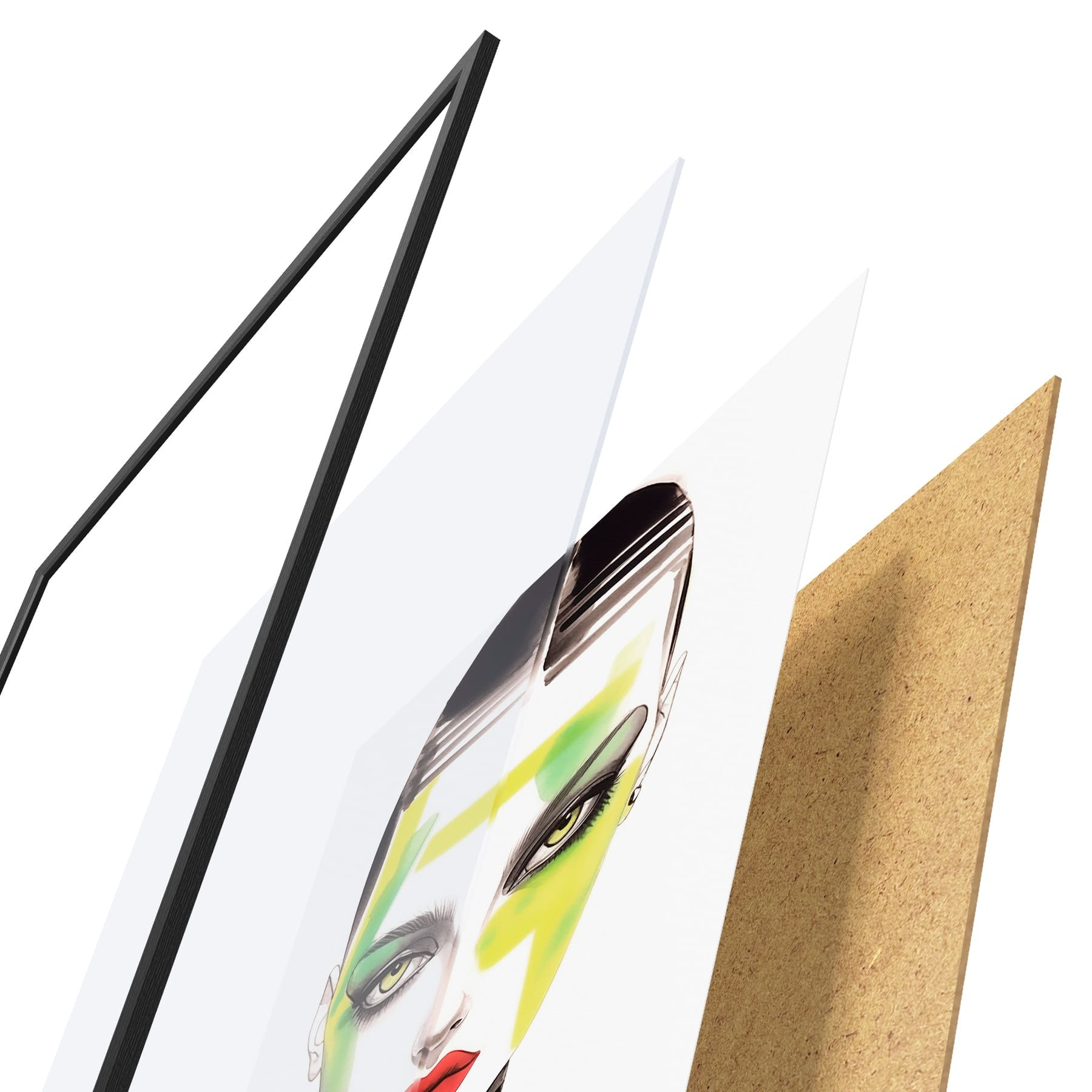 Plakāts sastāv no rāmja, pleksstikla, iespiestā attēla un skaidu plātnes pamatnes. Plakātu var uzreiz piekarināt pie sienas, pateicoties aizmugurē esošajiem stiprinājumiem.