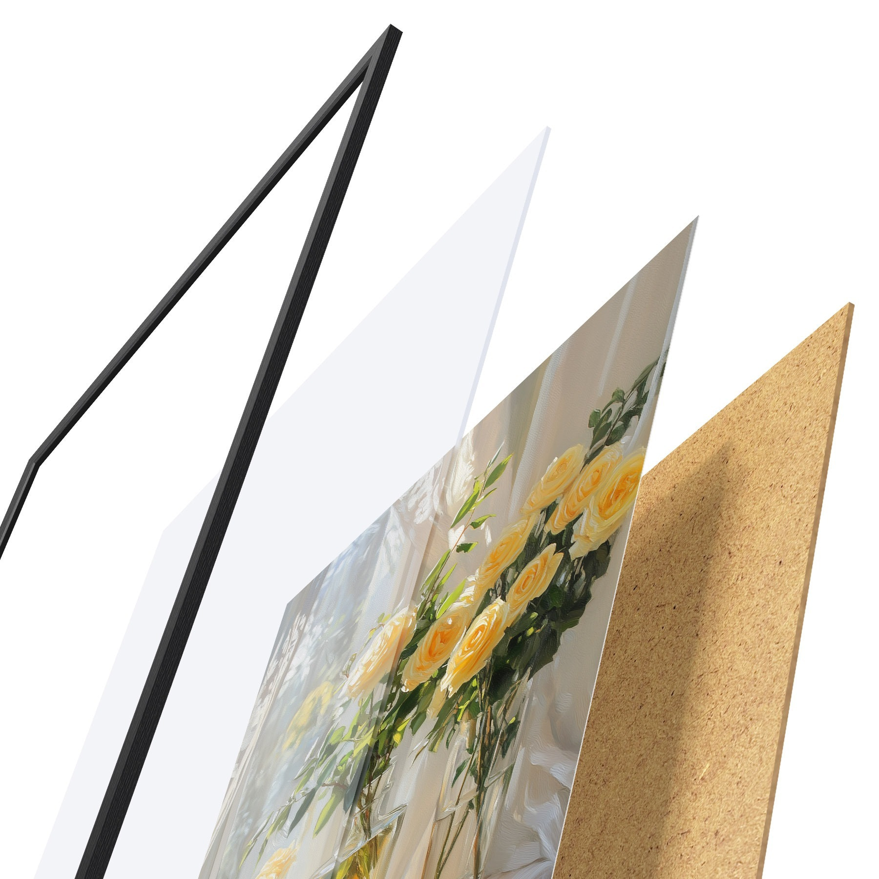 Plakāts sastāv no rāmja, pleksstikla, iespiestā attēla un skaidu plātnes pamatnes. Plakātu var uzreiz piekarināt pie sienas, pateicoties aizmugurē esošajiem stiprinājumiem.
