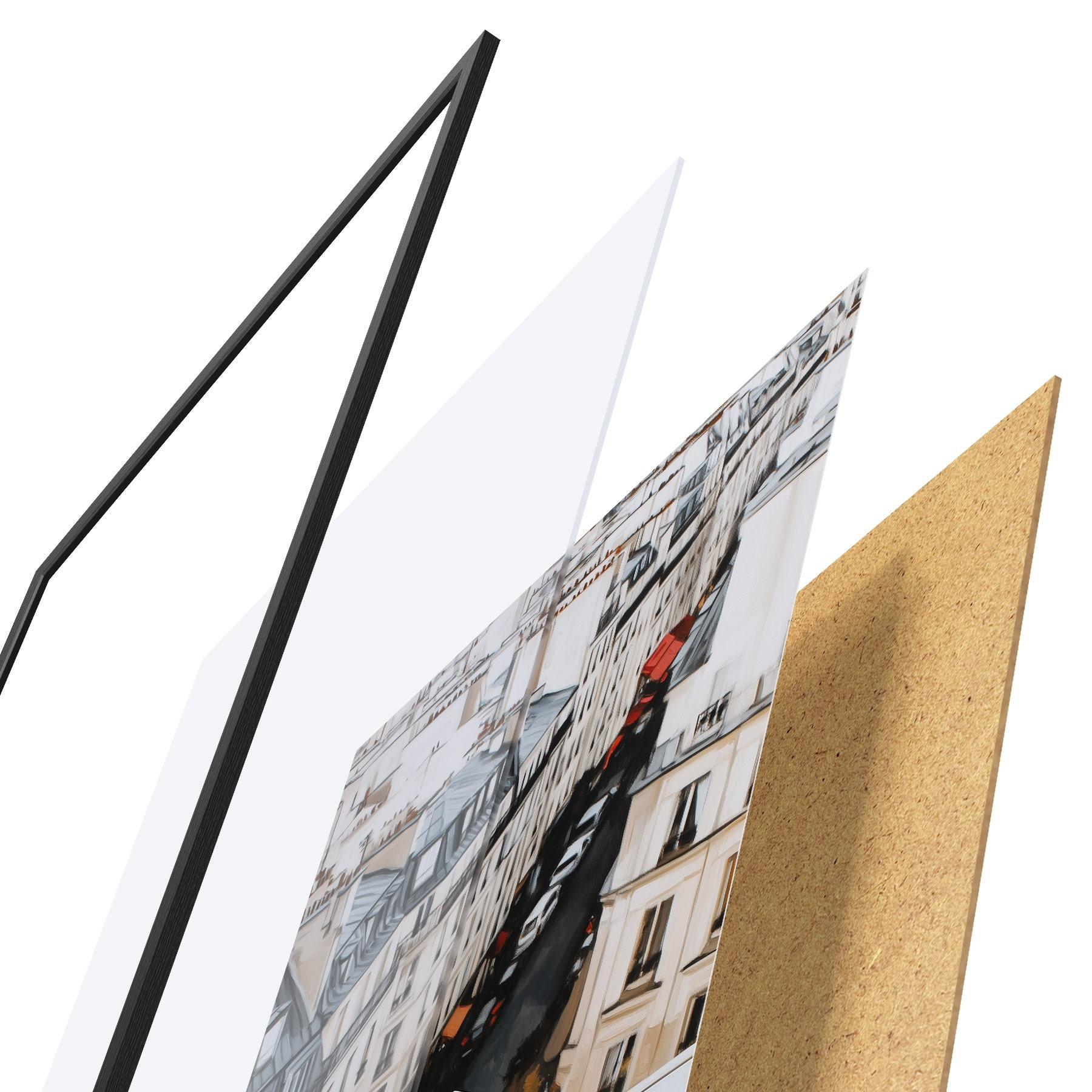 Plakāts sastāv no rāmja, pleksstikla, iespiestā attēla un skaidu plātnes pamatnes. Plakātu var uzreiz piekarināt pie sienas, pateicoties aizmugurē esošajiem stiprinājumiem.