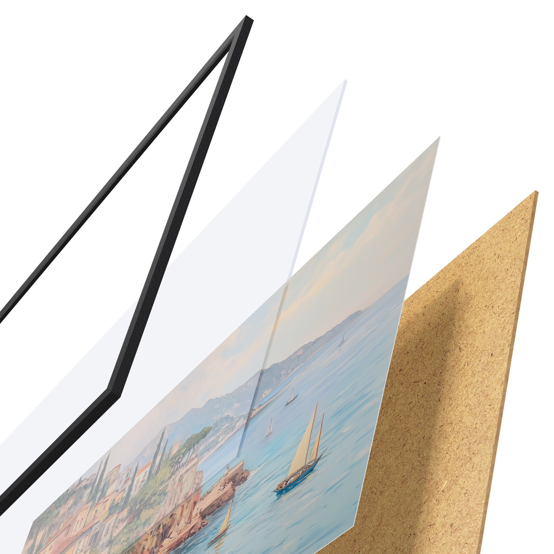 Plakāts sastāv no rāmja, pleksstikla, iespiestā attēla un skaidu plātnes pamatnes. Plakātu var uzreiz piekarināt pie sienas, pateicoties aizmugurē esošajiem stiprinājumiem.