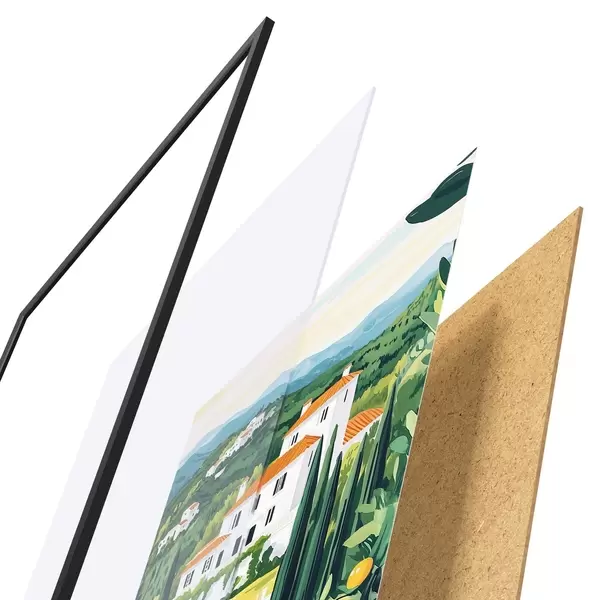 Plakāts sastāv no rāmja, pleksstikla, iespiestā attēla un skaidu plātnes pamatnes. Plakātu var uzreiz piekarināt pie sienas, pateicoties aizmugurē esošajiem stiprinājumiem.