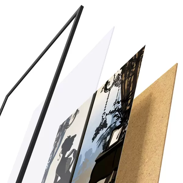 Plakāts sastāv no rāmja, pleksstikla, iespiestā attēla un skaidu plātnes pamatnes. Plakātu var uzreiz piekarināt pie sienas, pateicoties aizmugurē esošajiem stiprinājumiem.