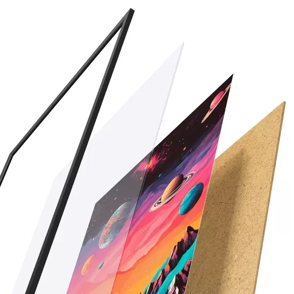 Plakāts sastāv no rāmja, pleksstikla, iespiestā attēla un skaidu plātnes pamatnes. Plakātu var uzreiz piekarināt pie sienas, pateicoties aizmugurē esošajiem stiprinājumiem.