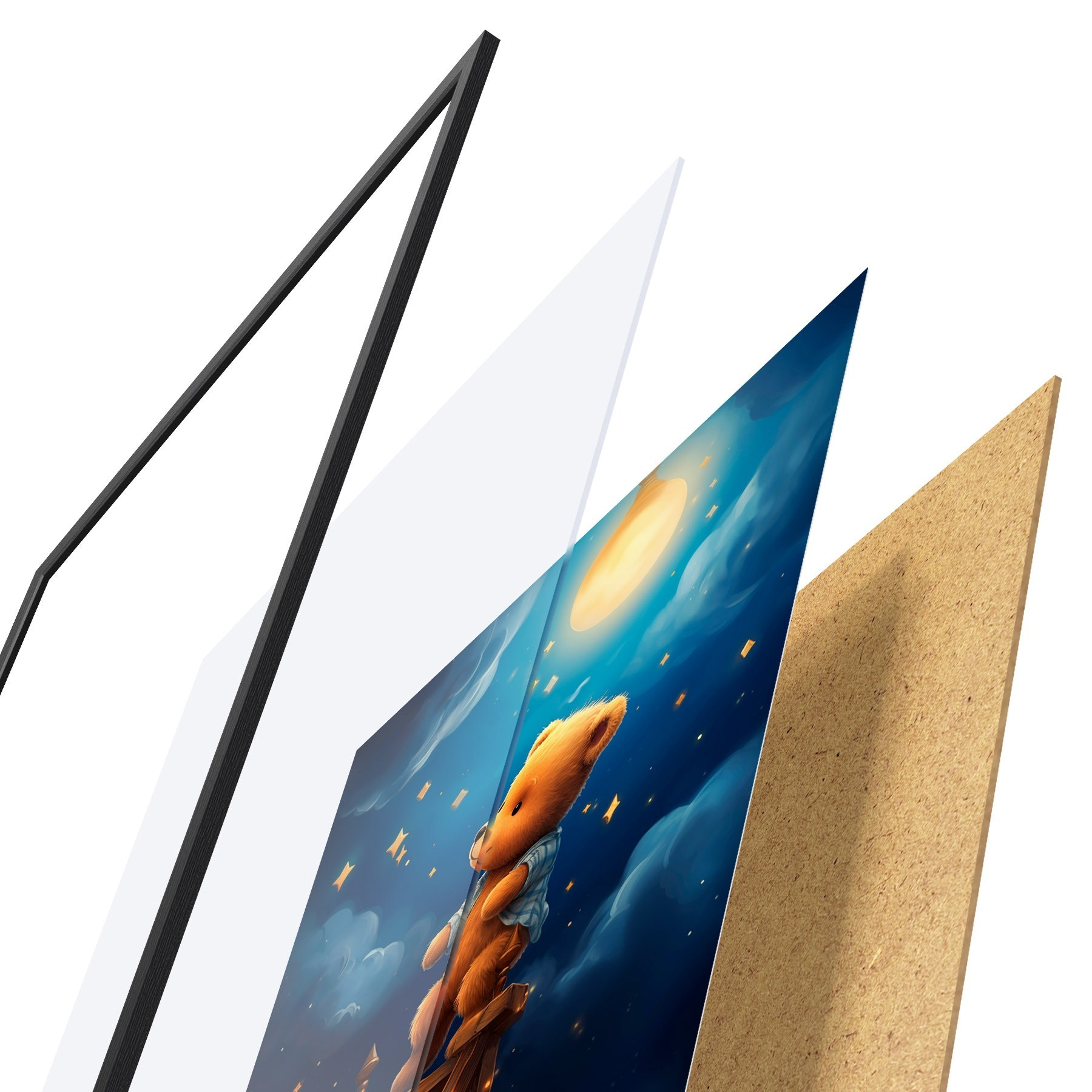 Plakāts sastāv no rāmja, pleksstikla, iespiestā attēla un skaidu plātnes pamatnes. Plakātu var uzreiz piekarināt pie sienas, pateicoties aizmugurē esošajiem stiprinājumiem.