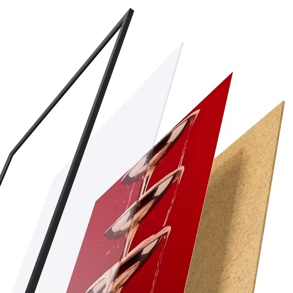 Plakāts sastāv no rāmja, pleksstikla, iespiestā attēla un skaidu plātnes pamatnes. Plakātu var uzreiz piekarināt pie sienas, pateicoties aizmugurē esošajiem stiprinājumiem.