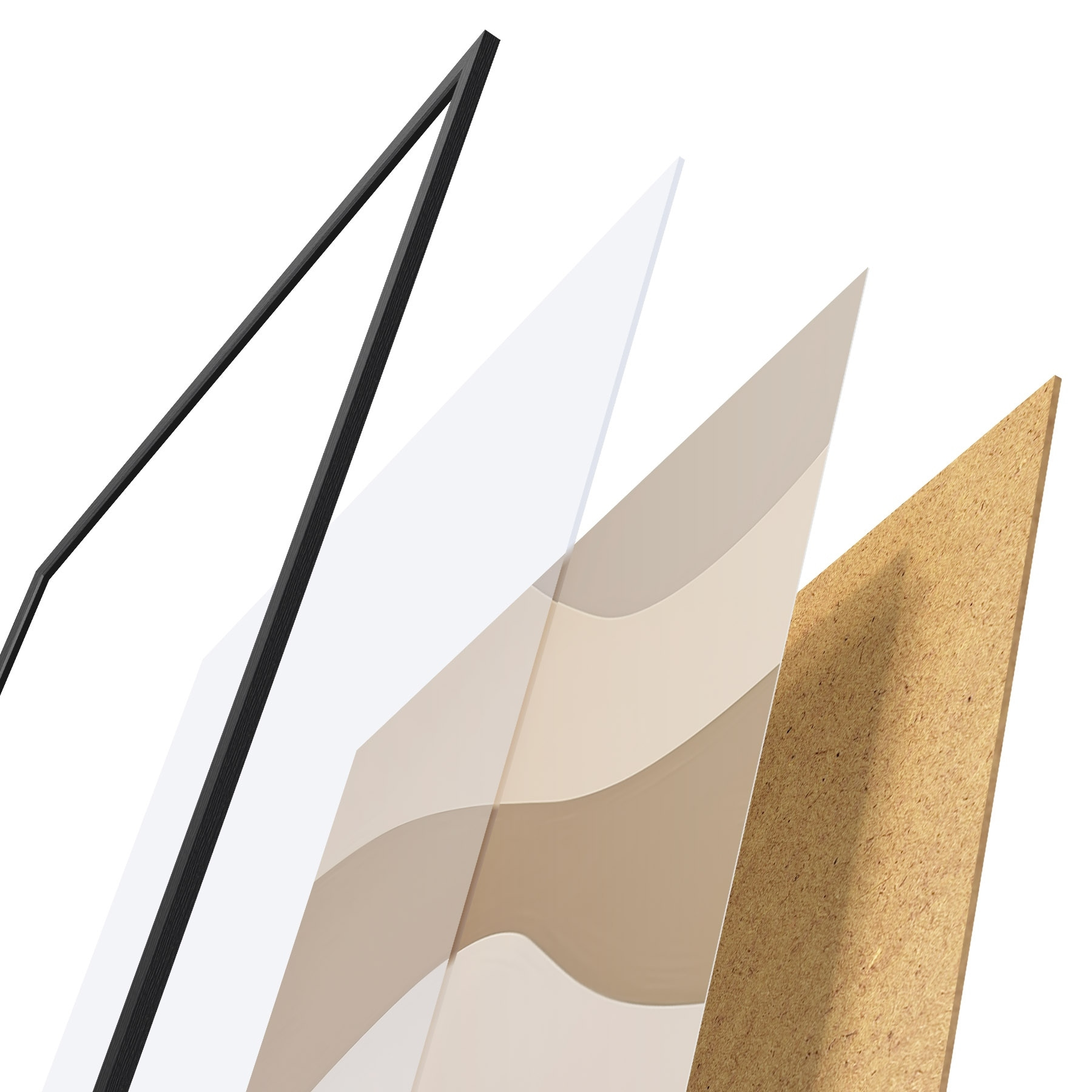 Plakāts sastāv no rāmja, pleksstikla, iespiestā attēla un skaidu plātnes pamatnes. Plakātu var uzreiz piekarināt pie sienas, pateicoties aizmugurē esošajiem stiprinājumiem.