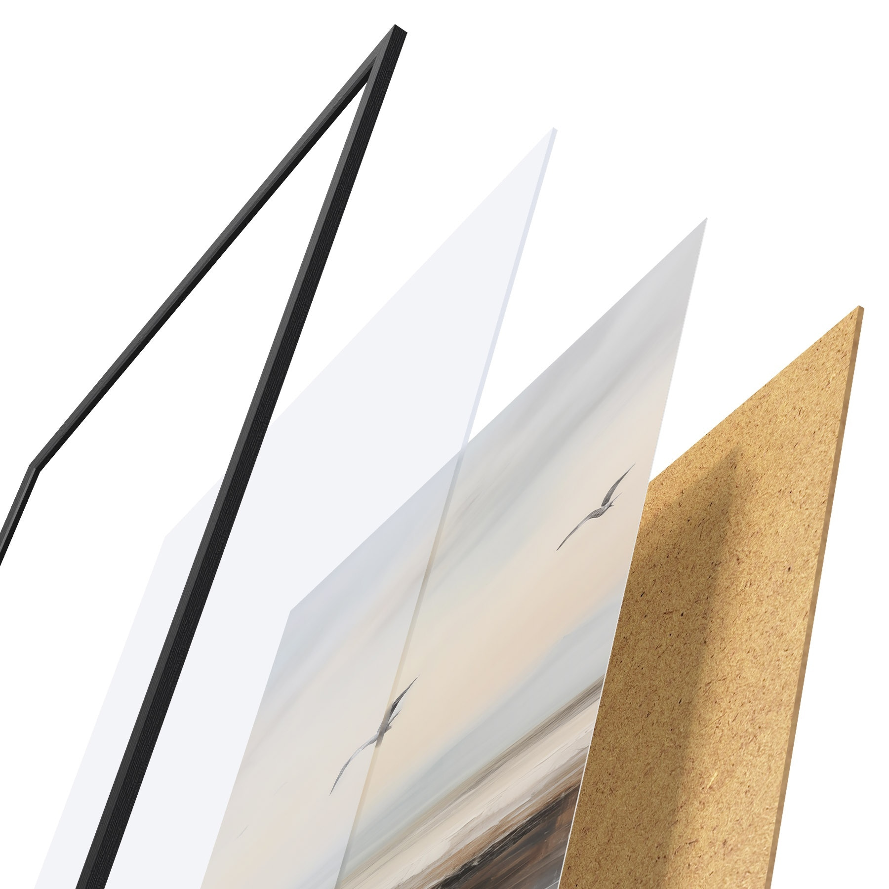 Plakāts sastāv no rāmja, pleksstikla, iespiestā attēla un skaidu plātnes pamatnes. Plakātu var uzreiz piekarināt pie sienas, pateicoties aizmugurē esošajiem stiprinājumiem.