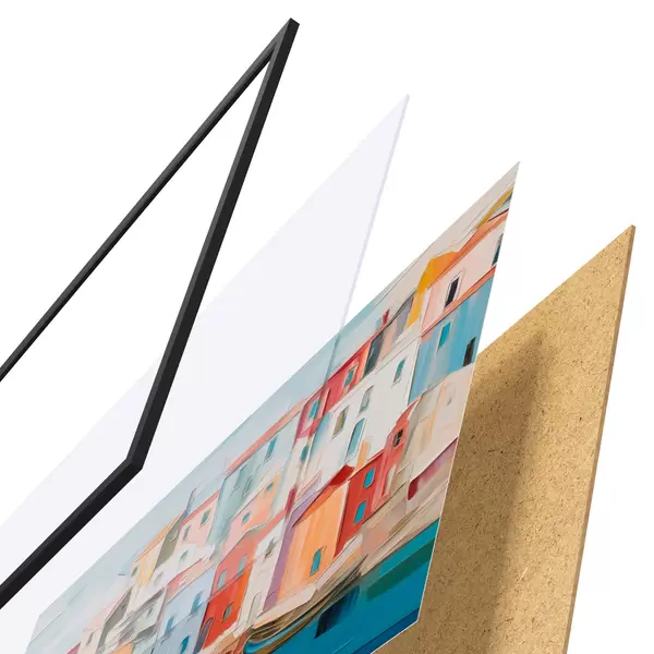 Plakāts sastāv no rāmja, pleksstikla, iespiestā attēla un skaidu plātnes pamatnes. Plakātu var uzreiz piekarināt pie sienas, pateicoties aizmugurē esošajiem stiprinājumiem.