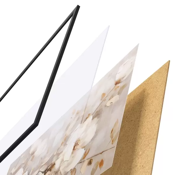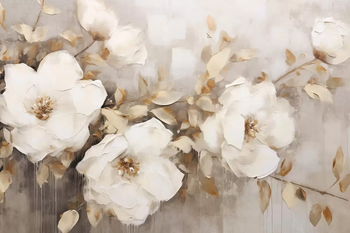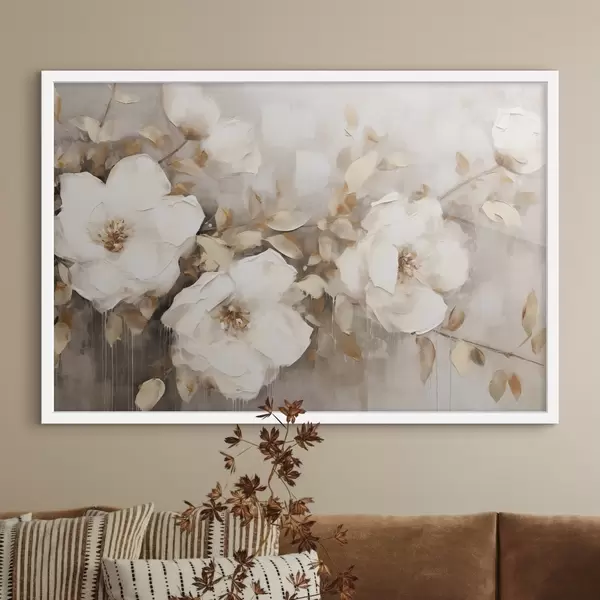 Plakāts Balti ziedi ar brūnām lapām smilškrāsas fona, eļļas glezna imitācija, ziedu kompozīcija, botāniskā māksla f44922