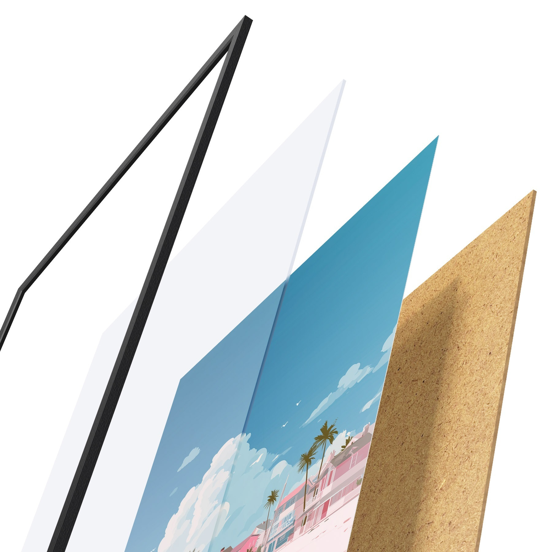 Plakāts sastāv no rāmja, pleksstikla, iespiestā attēla un skaidu plātnes pamatnes. Plakātu var uzreiz piekarināt pie sienas, pateicoties aizmugurē esošajiem stiprinājumiem.