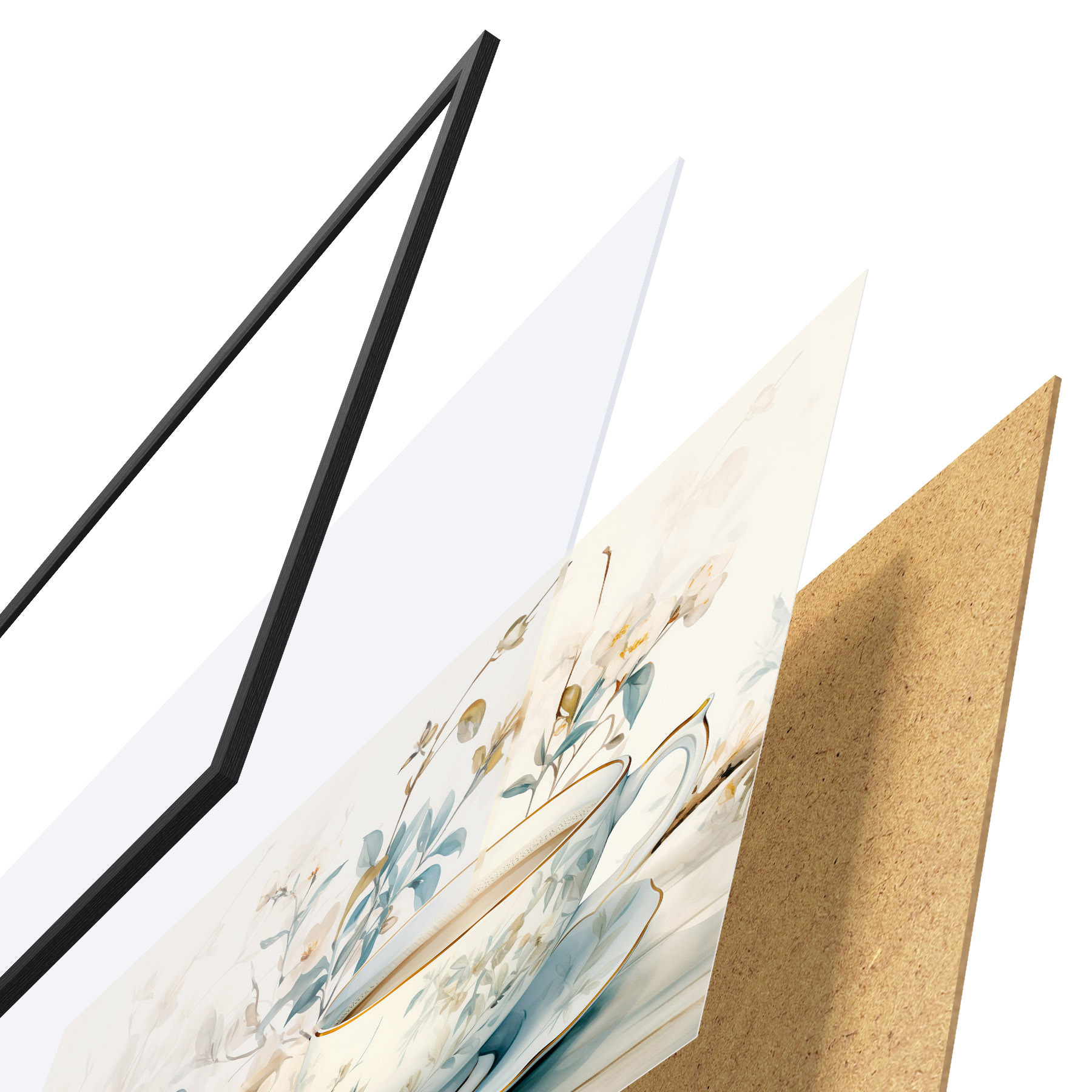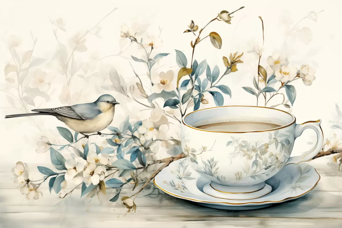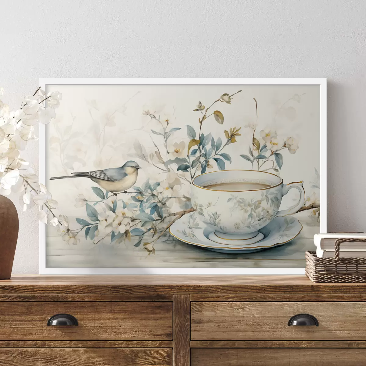 Plakāts Putns uz zara ar ziediem pie krūzes pasteļtoņos Nr f45047
