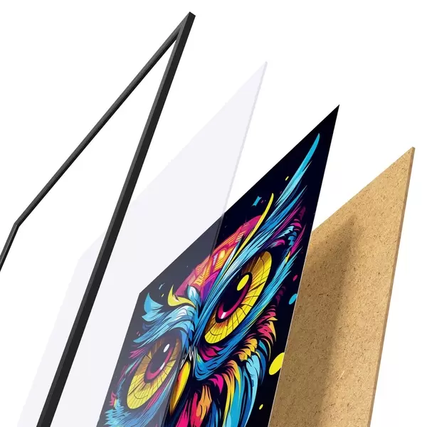 Plakāts sastāv no rāmja, pleksstikla, iespiestā attēla un skaidu plātnes pamatnes. Plakātu var uzreiz piekarināt pie sienas, pateicoties aizmugurē esošajiem stiprinājumiem.