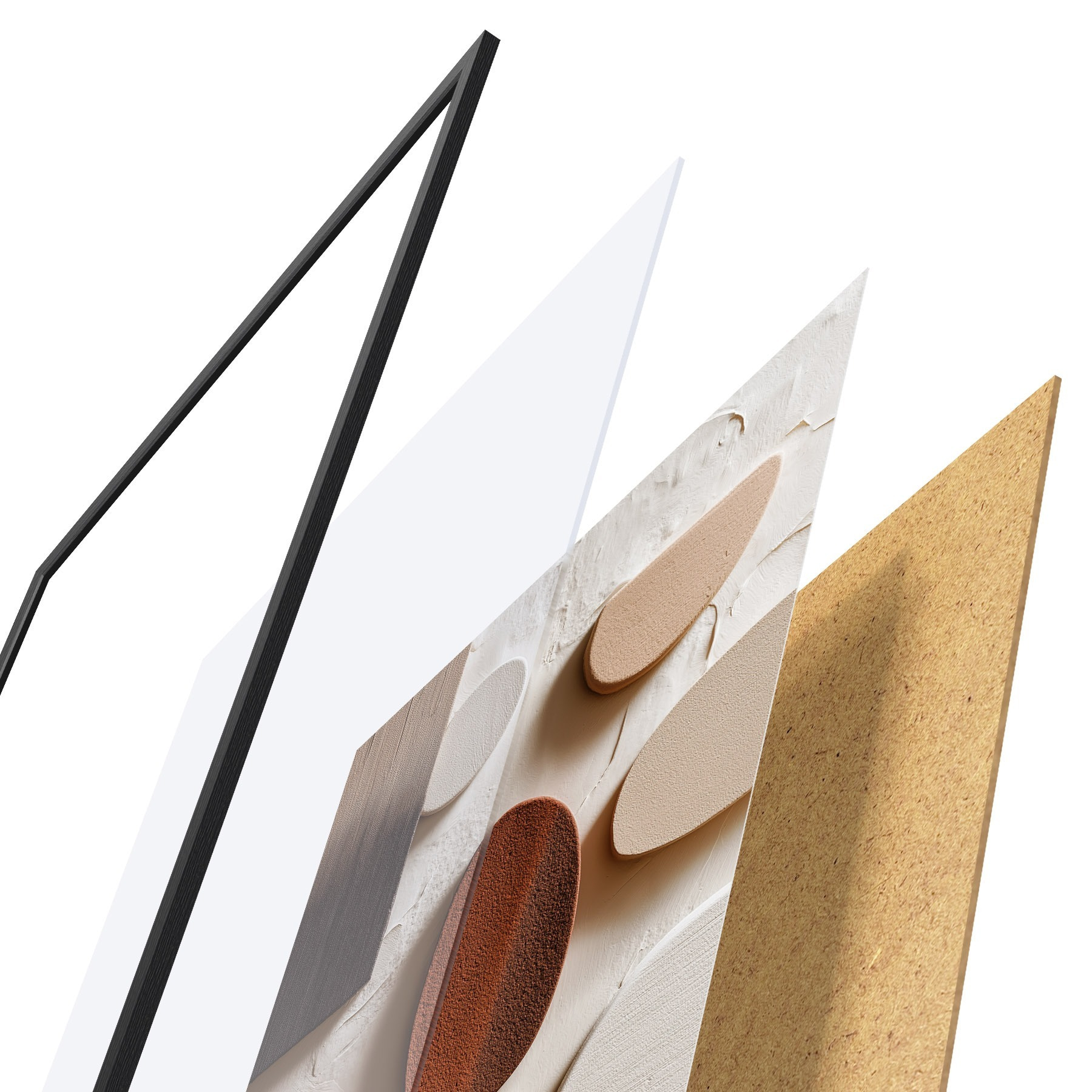 Plakāts sastāv no rāmja, pleksstikla, iespiestā attēla un skaidu plātnes pamatnes. Plakātu var uzreiz piekarināt pie sienas, pateicoties aizmugurē esošajiem stiprinājumiem.