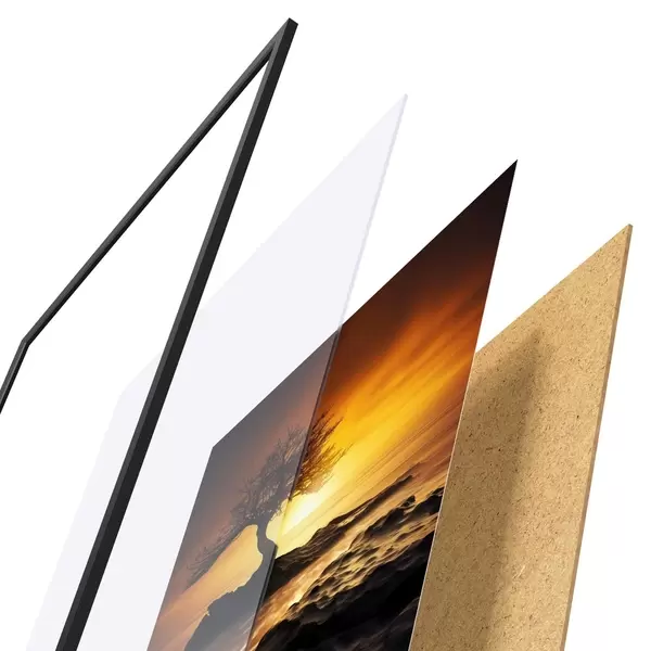 Plakāts sastāv no rāmja, pleksstikla, iespiestā attēla un skaidu plātnes pamatnes. Plakātu var uzreiz piekarināt pie sienas, pateicoties aizmugurē esošajiem stiprinājumiem.