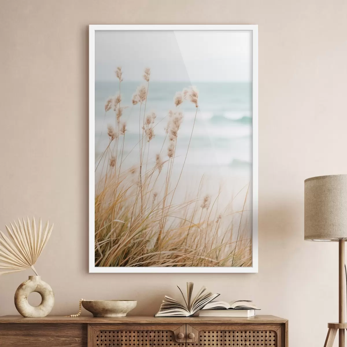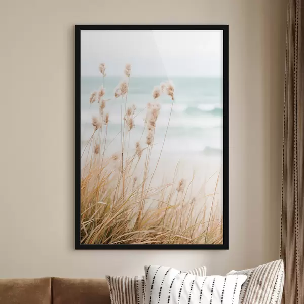 SākumlapaPlakātu katalogsPlakāti daba jūraPlakāts Augsta zāle ar pūkainām sēklu galviņām, smilšaina pludmale un okeāna viļņi fonā, maiga un pieklusināta krāsu palete Nr f45561