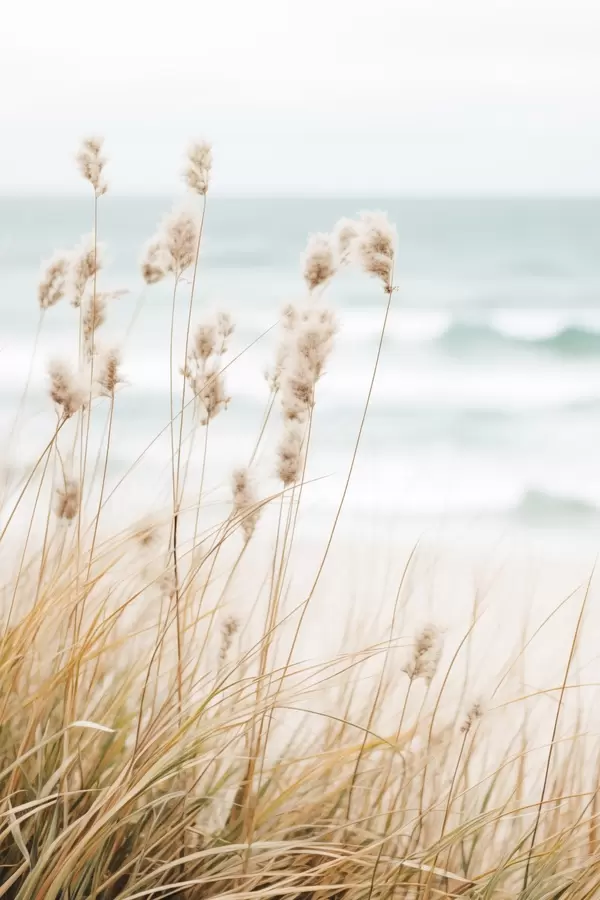 SākumlapaPlakātu katalogsPlakāti daba jūraPlakāts Augsta zāle ar pūkainām sēklu galviņām, smilšaina pludmale un okeāna viļņi fonā, maiga un pieklusināta krāsu palete Nr f45561