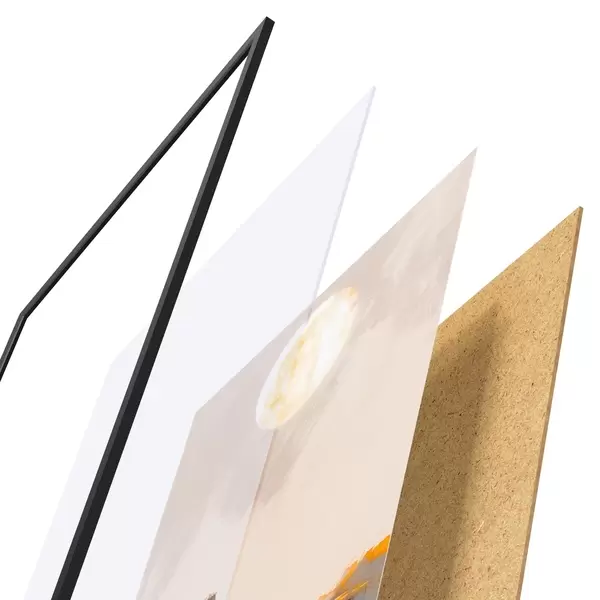 Plakāts sastāv no rāmja, pleksstikla, iespiestā attēla un skaidu plātnes pamatnes. Plakātu var uzreiz piekarināt pie sienas, pateicoties aizmugurē esošajiem stiprinājumiem.