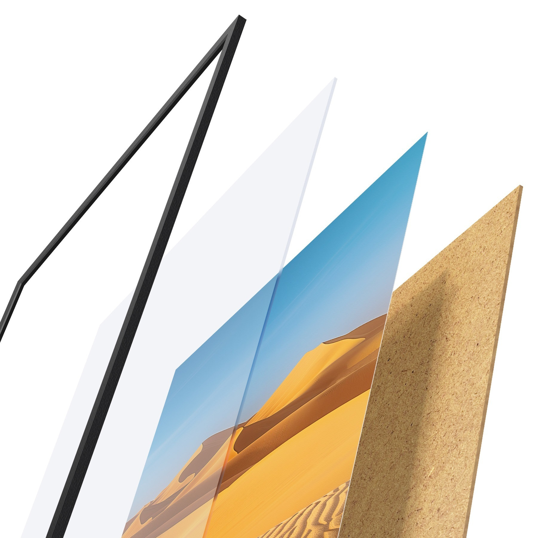 Plakāts sastāv no rāmja, pleksstikla, iespiestā attēla un skaidu plātnes pamatnes. Plakātu var uzreiz piekarināt pie sienas, pateicoties aizmugurē esošajiem stiprinājumiem.