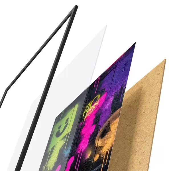 Plakāts sastāv no rāmja, pleksstikla, iespiestā attēla un skaidu plātnes pamatnes. Plakātu var uzreiz piekarināt pie sienas, pateicoties aizmugurē esošajiem stiprinājumiem.