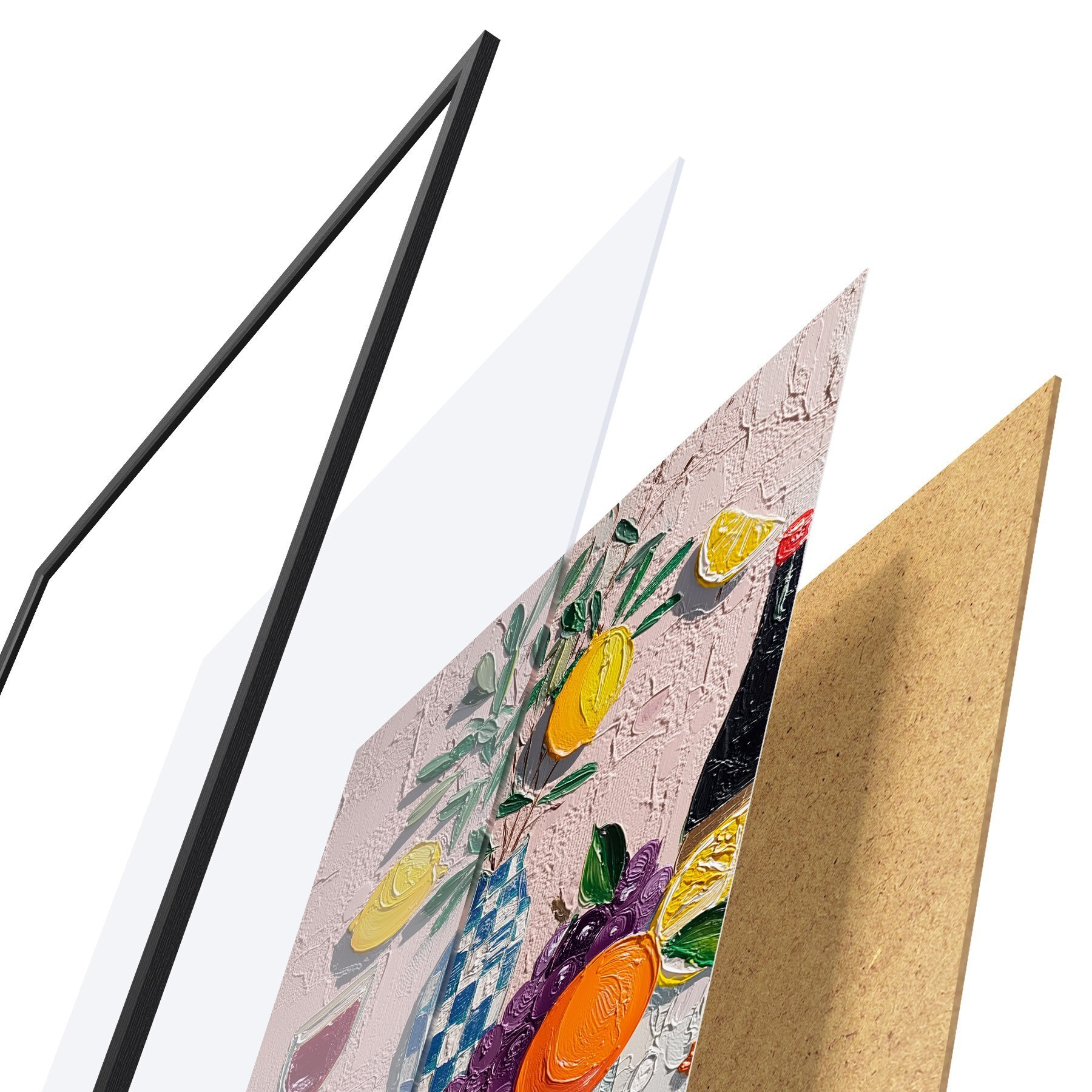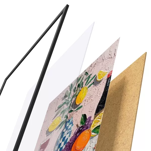 Plakāts sastāv no rāmja, pleksstikla, iespiestā attēla un skaidu plātnes pamatnes. Plakātu var uzreiz piekarināt pie sienas, pateicoties aizmugurē esošajiem stiprinājumiem.