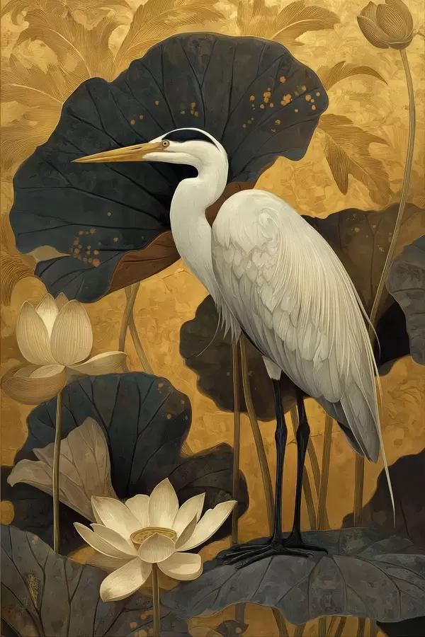 Plakāts Gārnis starp lotosiem uz siltā fona Nr f46148