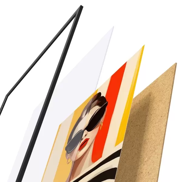 Plakāts sastāv no rāmja, pleksstikla, iespiestā attēla un skaidu plātnes pamatnes. Plakātu var uzreiz piekarināt pie sienas, pateicoties aizmugurē esošajiem stiprinājumiem.