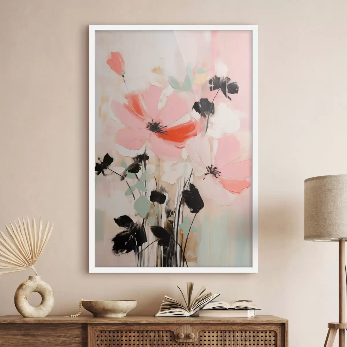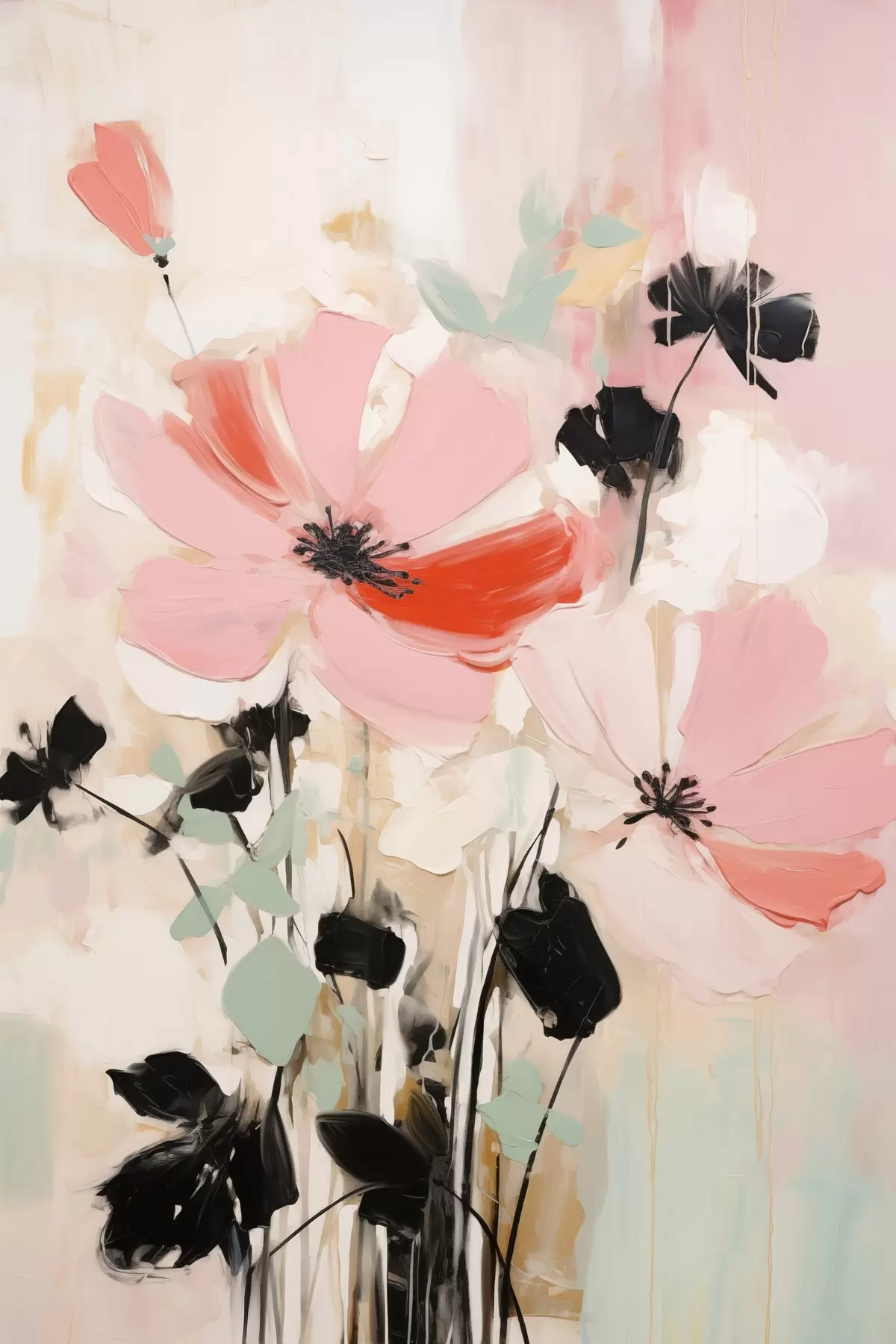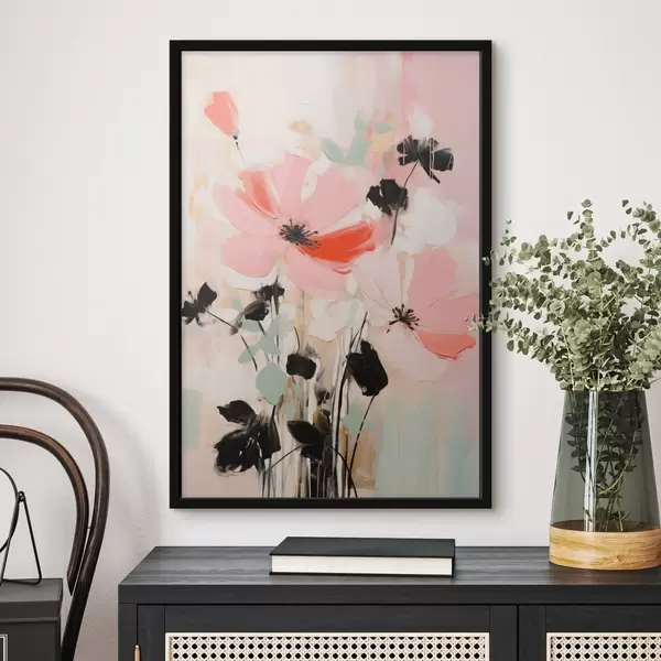 SākumlapaPlakātu katalogsPlakāti ziediPlakāts Rozā un melni ziedi ar lapām, maigas pasteļtoņos, abstrakts ziedu kompozīcija, minimālisma māksla Nr f46687