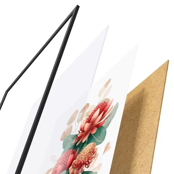 Plakāts sastāv no rāmja, pleksstikla, iespiestā attēla un skaidu plātnes pamatnes. Plakātu var uzreiz piekarināt pie sienas, pateicoties aizmugurē esošajiem stiprinājumiem.