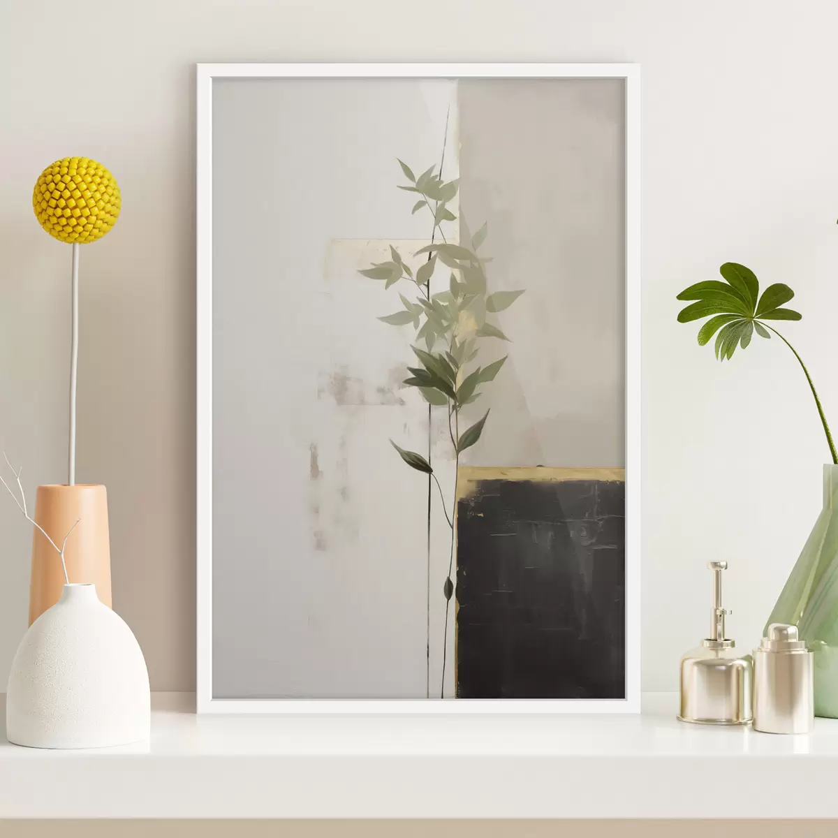 SākumlapaPlakātu katalogsPlakāti buferiPlakāts Minimālisma stilā veidota glezna, kurā attēlota vāze ar zaļām lapām uz abstraktu ģeometrisku figūru fona. Nr f47037