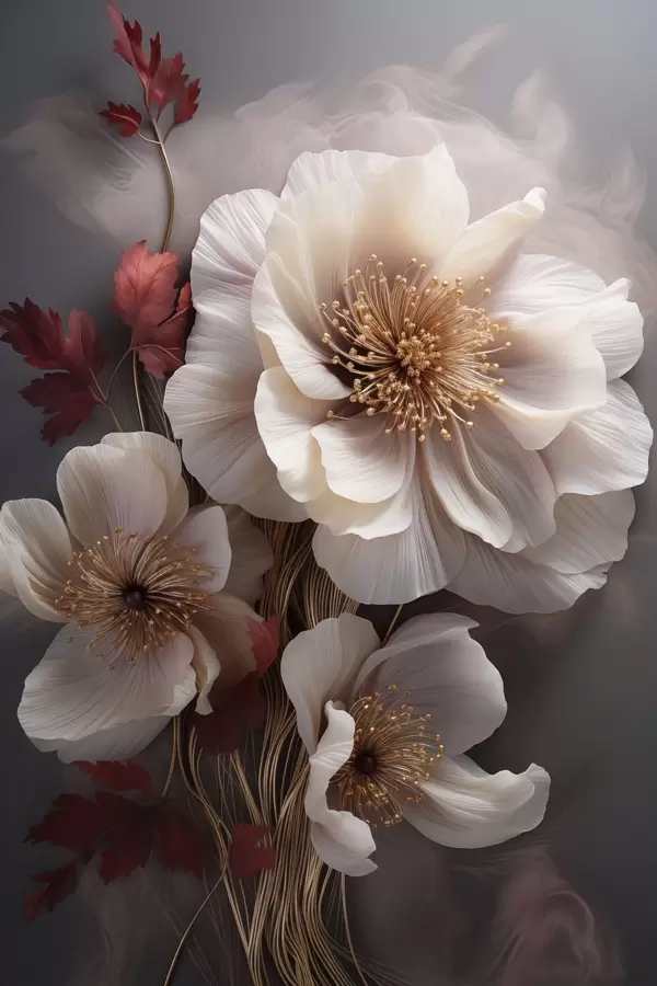 SākumlapaPlakātu katalogsPlakāti ziediPlakāts Delikātas peonijas ar plānām, plūstošām ziedlapām, apņemtas ar tumši sarkanām lapām uz abstraktā fona Nr f47434