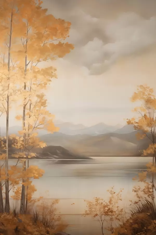 SākumlapaPlakātu katalogsPlakāti dabaPlakāts Rudens teksturēti koki ar oranžām lapām ierāmē mierīgu ezeru ar tālumā redzamām kalnām zem apmākušām debesīm. Nr f47441