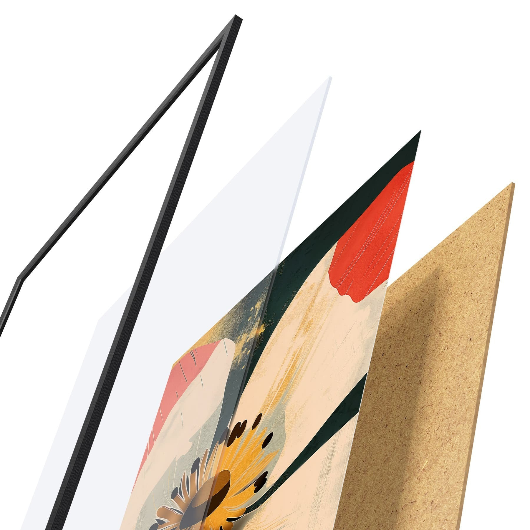 Plakāts sastāv no rāmja, pleksstikla, iespiestā attēla un skaidu plātnes pamatnes. Plakātu var uzreiz piekarināt pie sienas, pateicoties aizmugurē esošajiem stiprinājumiem.