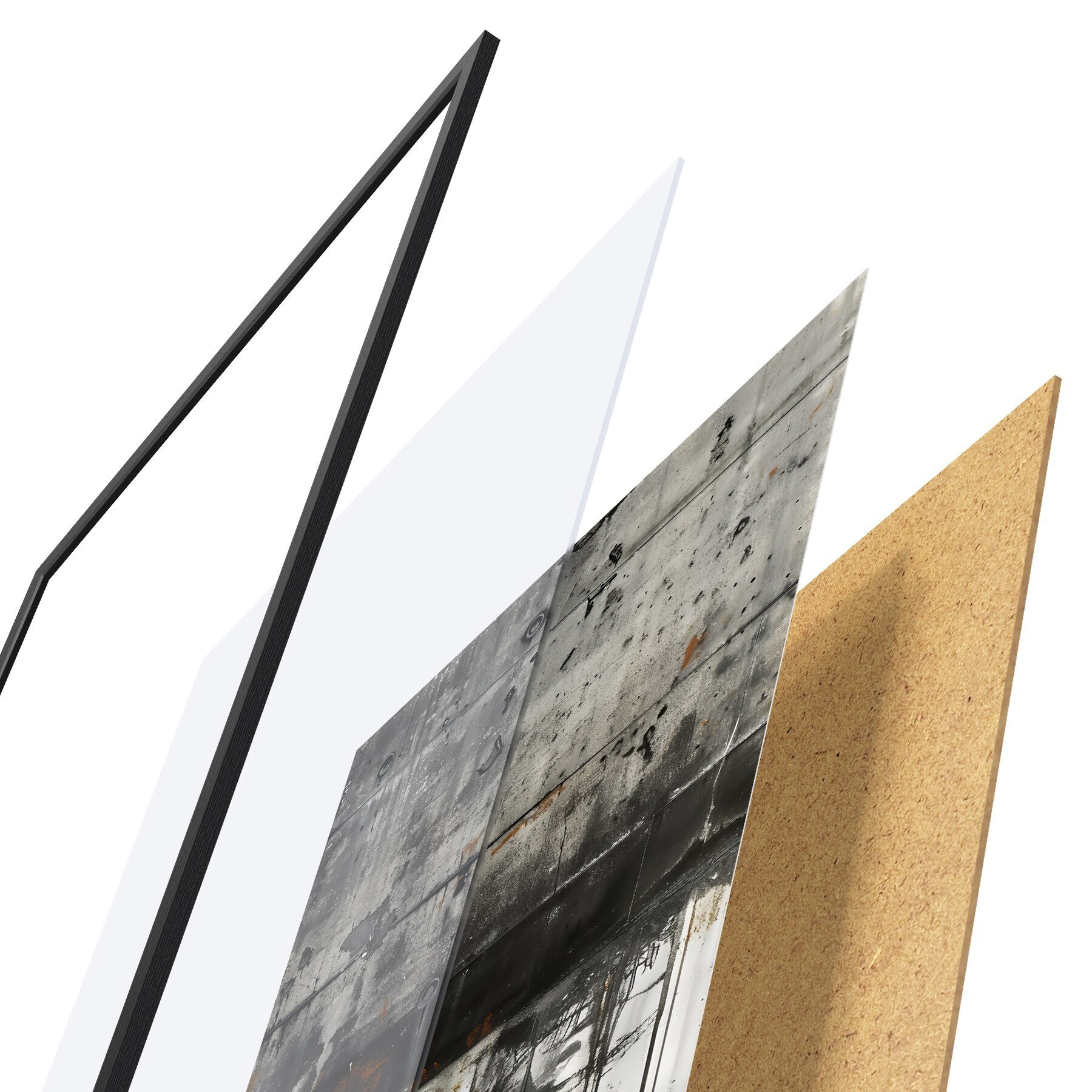 Plakāts sastāv no rāmja, pleksstikla, iespiestā attēla un skaidu plātnes pamatnes. Plakātu var uzreiz piekarināt pie sienas, pateicoties aizmugurē esošajiem stiprinājumiem.