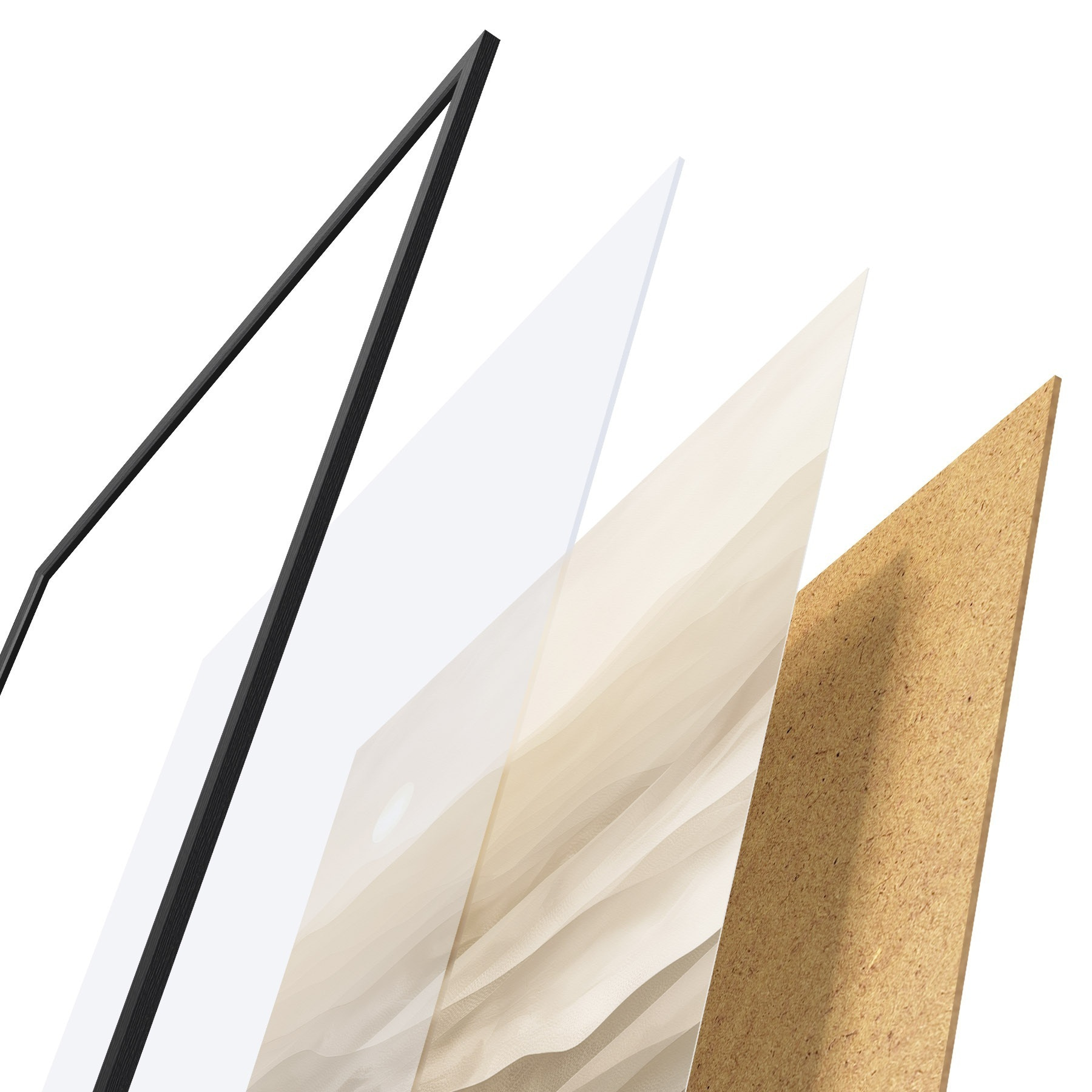 Plakāts sastāv no rāmja, pleksstikla, iespiestā attēla un skaidu plātnes pamatnes. Plakātu var uzreiz piekarināt pie sienas, pateicoties aizmugurē esošajiem stiprinājumiem.