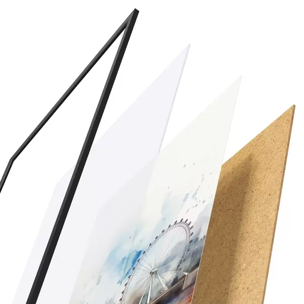 Plakāts sastāv no rāmja, pleksstikla, iespiestā attēla un skaidu plātnes pamatnes. Plakātu var uzreiz piekarināt pie sienas, pateicoties aizmugurē esošajiem stiprinājumiem.