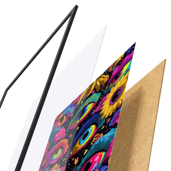 Plakāts sastāv no rāmja, pleksstikla, iespiestā attēla un skaidu plātnes pamatnes. Plakātu var uzreiz piekarināt pie sienas, pateicoties aizmugurē esošajiem stiprinājumiem.