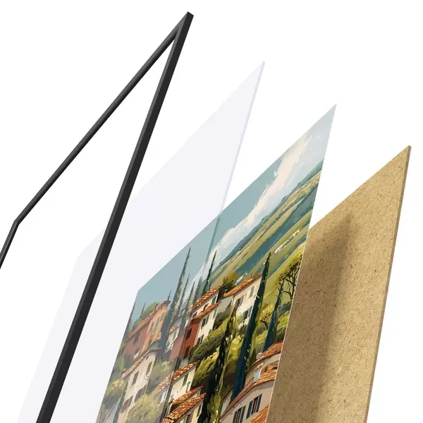 Plakāts sastāv no rāmja, pleksstikla, iespiestā attēla un skaidu plātnes pamatnes. Plakātu var uzreiz piekarināt pie sienas, pateicoties aizmugurē esošajiem stiprinājumiem.