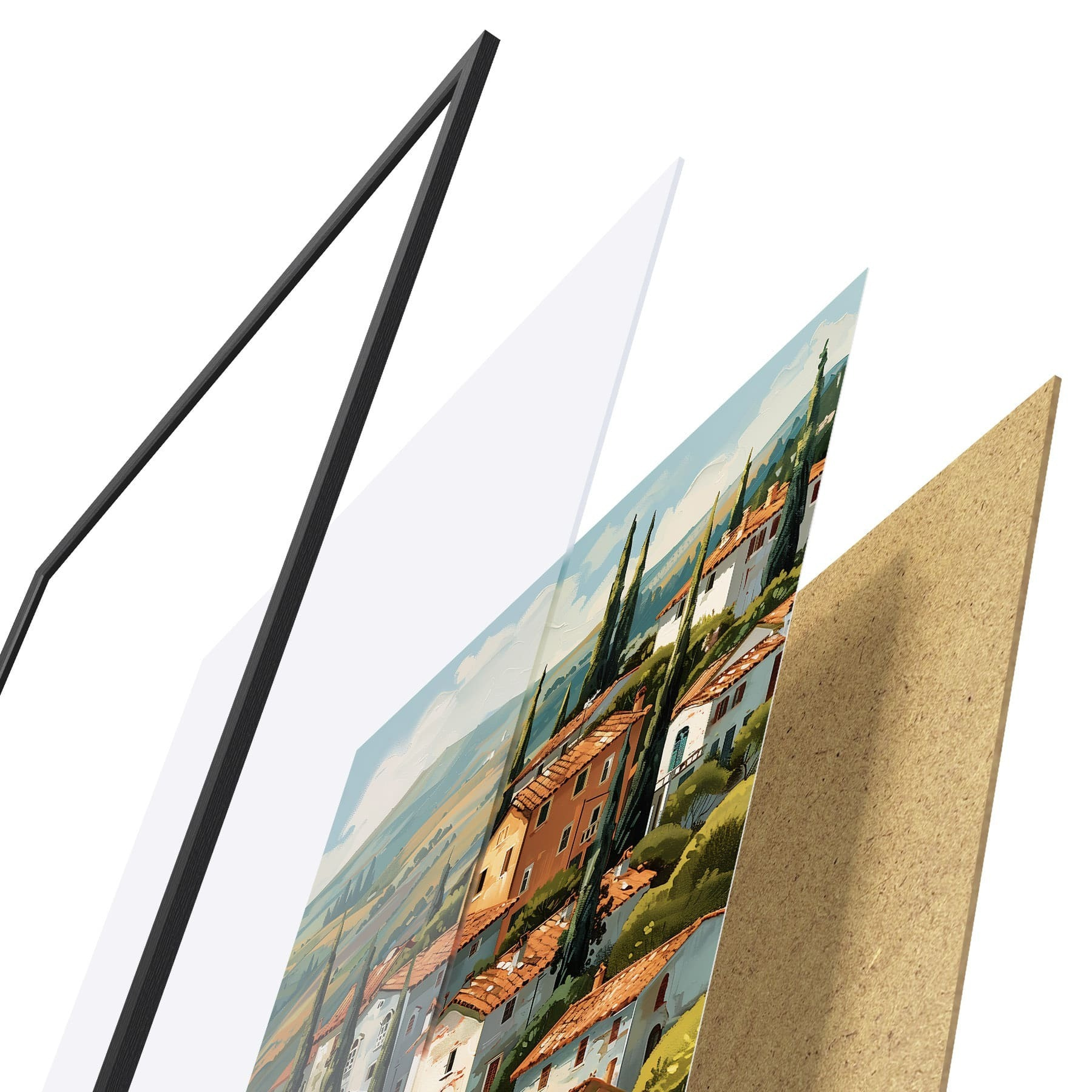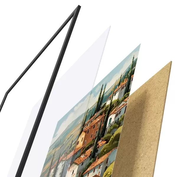 Plakāts sastāv no rāmja, pleksstikla, iespiestā attēla un skaidu plātnes pamatnes. Plakātu var uzreiz piekarināt pie sienas, pateicoties aizmugurē esošajiem stiprinājumiem.