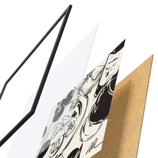 Plakāts sastāv no rāmja, pleksstikla, iespiestā attēla un skaidu plātnes pamatnes. Plakātu var uzreiz piekarināt pie sienas, pateicoties aizmugurē esošajiem stiprinājumiem.