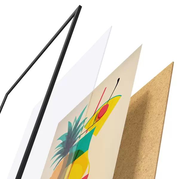 Plakāts sastāv no rāmja, pleksstikla, iespiestā attēla un skaidu plātnes pamatnes. Plakātu var uzreiz piekarināt pie sienas, pateicoties aizmugurē esošajiem stiprinājumiem.