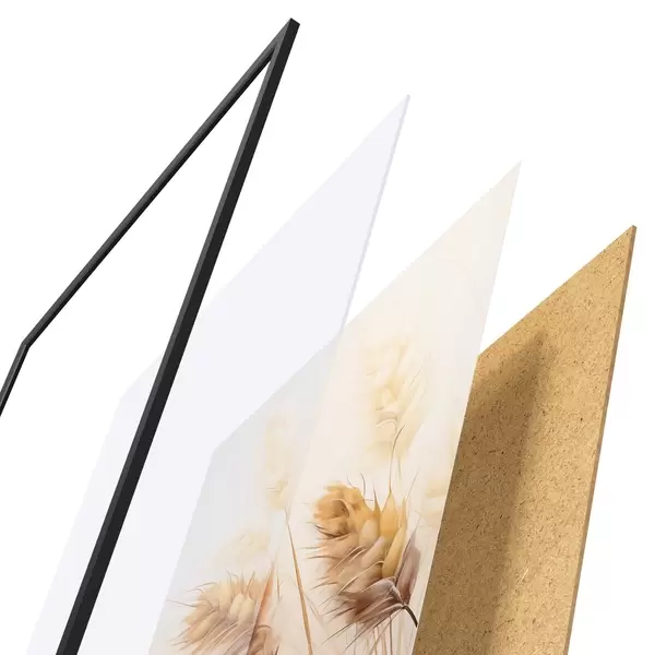 Plakāts sastāv no rāmja, pleksstikla, iespiestā attēla un skaidu plātnes pamatnes. Plakātu var uzreiz piekarināt pie sienas, pateicoties aizmugurē esošajiem stiprinājumiem.